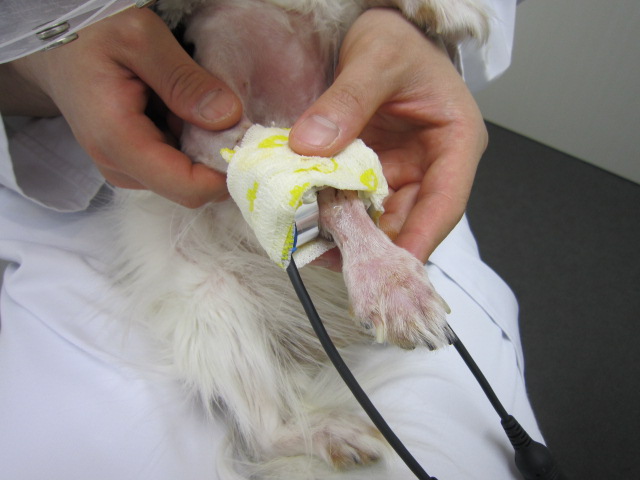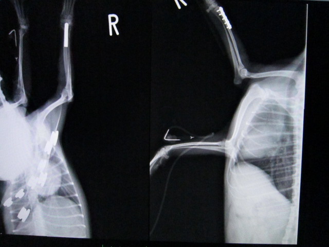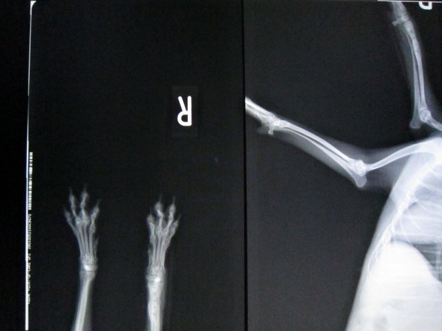 さくを飛び越えたときにキャンと鳴いて右前足を痛がっているとのことで来院。レントゲンにより、右橈尺骨遠位端骨折を確認した。