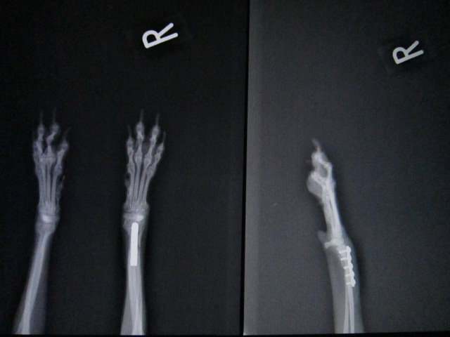 1週間外固定で様子を見たが悪化したため、手術によりプレート固定を行った。