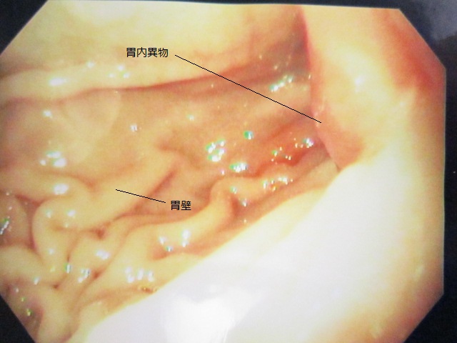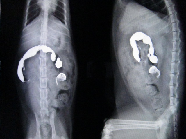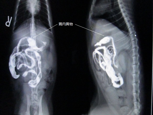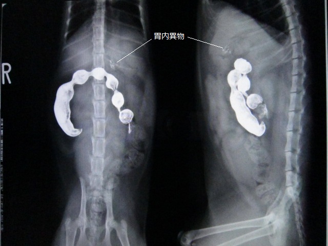 何回も吐いているとのことで来院。拾い食いのクセがあるらしく、バリウム検査を行った。
