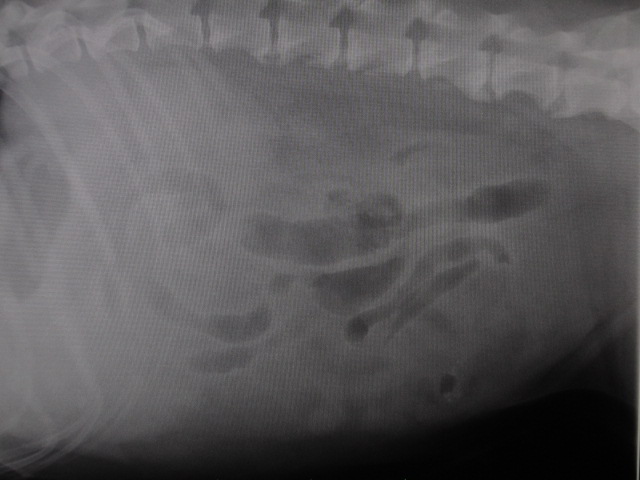 腹水がたまっており、お腹に腫瘍があるとのことで来院。食欲もなかった。検査の結果、脾臓あたりに腫瘍があり、貧血(Ht19.6)もあったため、脾臓腫瘍からの出血を疑い、緊急手術を行った。