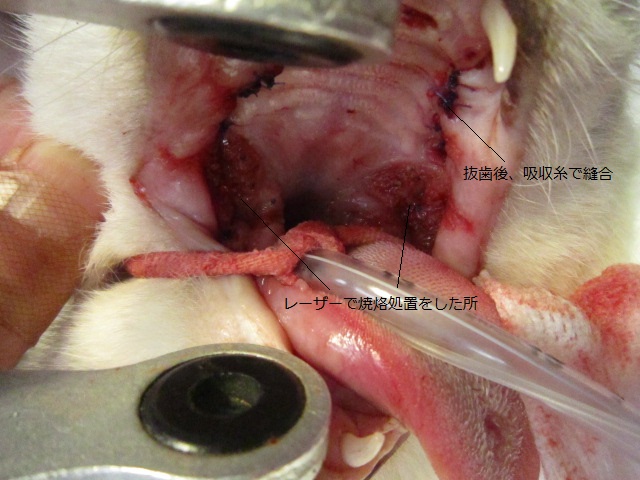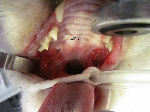 半年前から口を痛がっているとのことで来院。歯肉炎に加えて口内炎もひどかったため、犬歯以外の全抜歯とレーザー焼烙処置を行った。